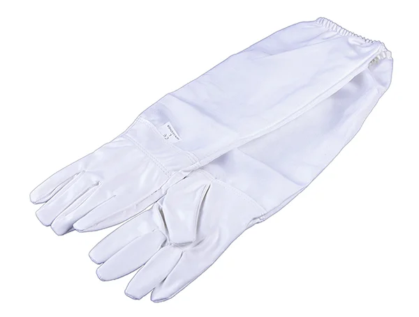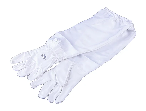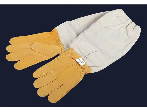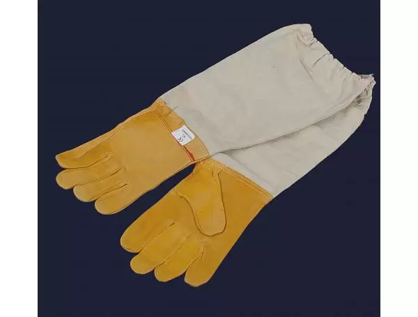 Материалы и элементы, используемые при изготовлении товара: Перчатки изготовлены из натуральной кожи (верхнего слоя кожи, полученного в результате слоения шкуры и окрашенного в желтый цвет) и пришитых к ним двурядным швом нарукавников из белой саржи. В свободные концы нарукавников вставлены обтягивающие резинки, которые не дают пчёлам забраться под ткань.