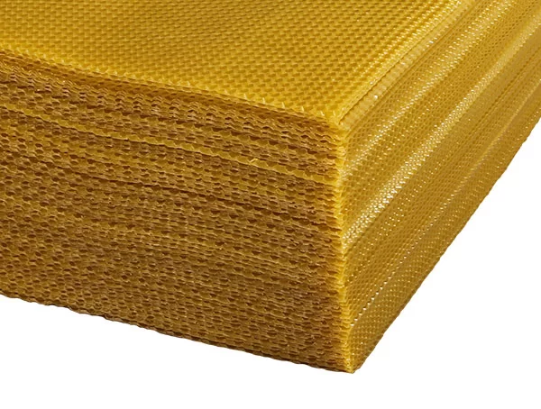 Цвет вощины - от светло-желтого до насыщенно-желтого. Обладает естественным восковым запахом, имеет равномерную толщину и одинаковые размеры ячеек.
