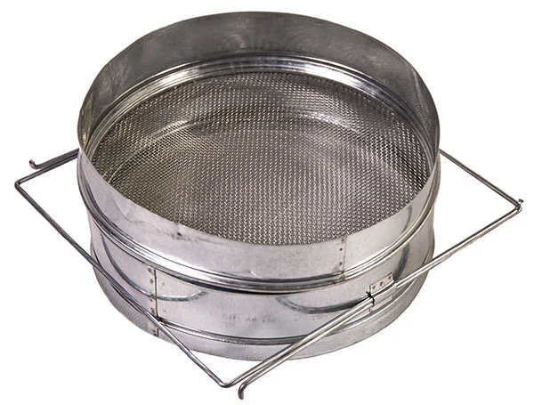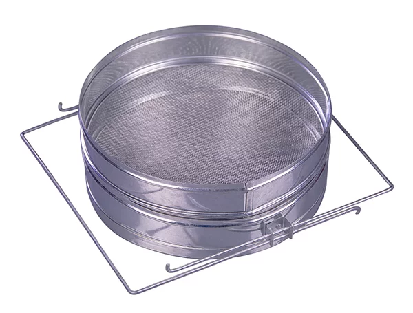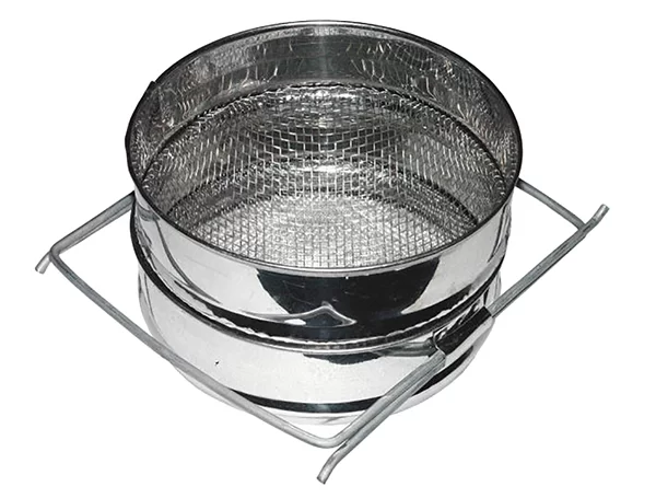 • Применяются на пасеках трехсекционные погружные фильтры. Они имеют корпус из стали, внутри него - фильтрующий элемент: наружная и внутренняя сетки с ячейками разного размера (у внутренней - покрупнее, у внешней – мельче). Мед при откачивании наливают внутрь фильтрующего элемента, закрыв внизу отверстие, а к верхнему заранее подставив емкость.